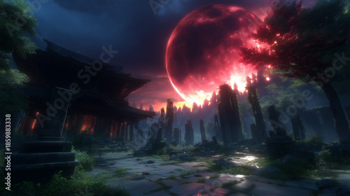 Anime style illustration of ancient ruins with stone pillars under a giant red moon and dark cloudy sky (巨大な赤い月と暗い曇り空の下にある石柱と古代遺跡のアニメ風イラスト)