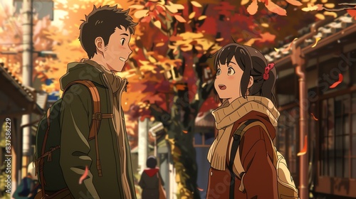 Animesque depiction of a young man and woman meeting on a city street in the fall. They are both smiling and wearing casual clothes.