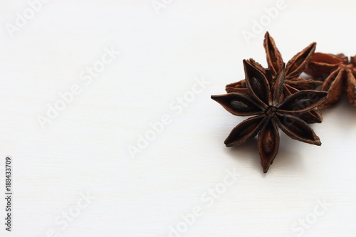 Anise stars closeup on white background with copy space. Aniseed isolated. Aromatic condiment. Healthy cooking. Organic spices.