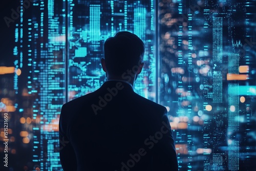 anonymous clandestine cyber person surrounded by modern technolgy with glowing data