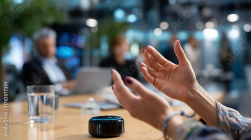 Anonymous users' hands gesturing while speaking with blurred figures and crystal clear AI assistant device visible, with copy space