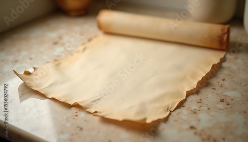 Antique aged parchment paper scroll unrolled on marble surface with soft light