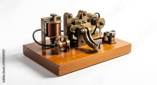 telegraph, machine, antique, vintage, brass, device, communication, technology, electrical, equipment, instrument, metal, copper, coil, wire, wood, footed, mechanism, key, morse code, transmitter, receiver, old, historic, retro, classic, patent, invention, science, engineering, studio, white background, cut-out, isolated, object, detail, closeup, indoor, horizontal, still life, history, innovation, discovery, education, telecom, message, connection, past