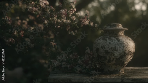 Antique ceramic jar with cracked glaze, surrounded by flowers.