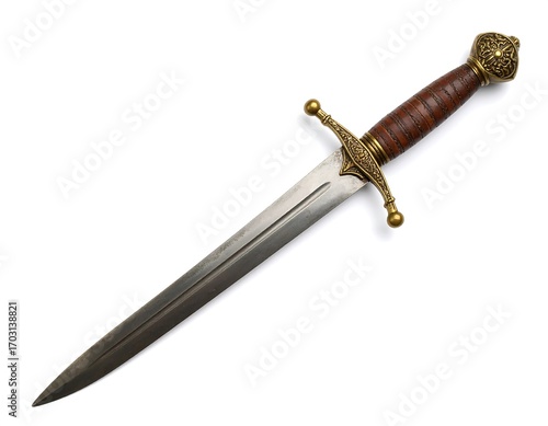 dagger, knife, antique, ornate, metal, handle, wooden, blade, sharp, historical, weapon, decorative, gold, brass, brown, steel, pointy, isolated, image, studio, light, sharpness, detail, closeup, long, traditional, mediaeval, luxury, object, weaponry