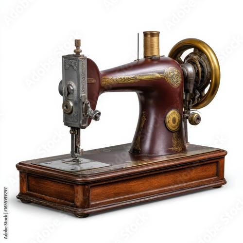 Antique Maroon Sewing Machine with Gold Accents on Wooden Base vintage retro
