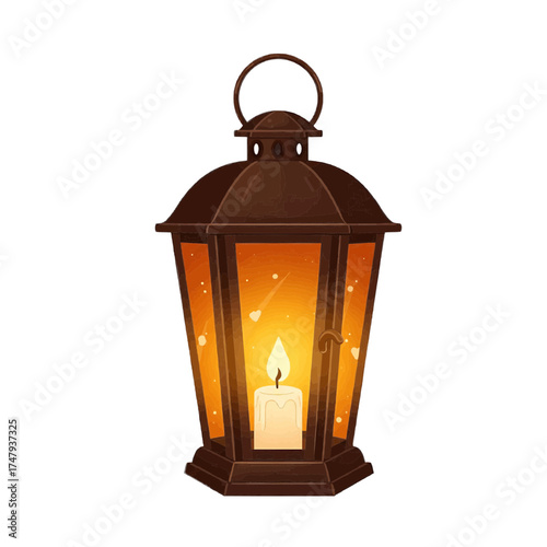 Antique metal lantern with burning candle inside, flat vector, brown and yellow, light and warmth concept