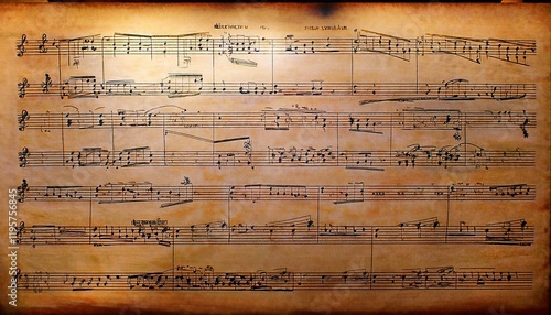 Antique sheet music, handwritten notes, aged paper, musical score.