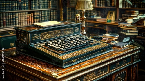 typewriter, antique, desk, library, vintage, writing, classic, ornate, wooden, grand, historical, study, decor, book, bookshelf, old, machinery, office, luxury, elegant, retro, writing desk, equipment, history, furniture, gold, detail, design, stylish, collection, workstation, workspace, manuscript, illumination, light, museum, rare, display, room