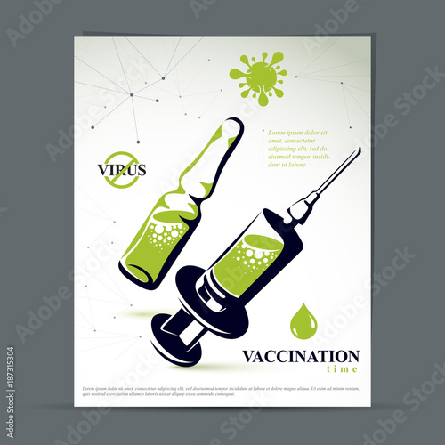 Antiviral vaccination promotion idea, brochure head page. Vector graphic illustration of ampoule with medicine and disposable syringe for injections to kill a virus.