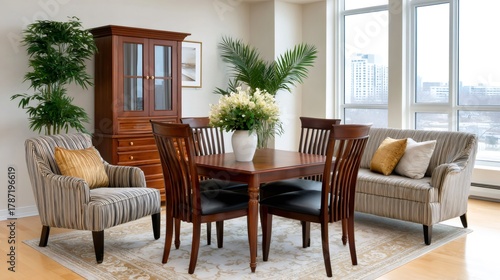 apartment, living room, dining room, interior design, furniture, home, house, residential, luxury, modern, comfortable, stylish, elegant, cosy, contemporary, roomy, bright, window, table, chair, sofa, couch, cabinet, armchair, vase, plant, daylight, indoor, domestic, property, real estate, decor, decoration, design, lifestyle, relaxation, comfort, wood, fabric, carpet, flooring, cushion, pillow, architecture, urban, city, city landscape, view, clean