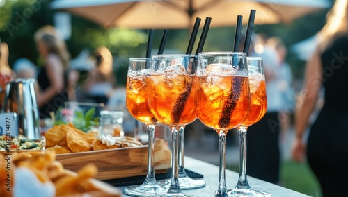 Aperol spritz cocktail glasses with black straws and snacks on an outdoor bar at a summer party in the garden of house, people walking around in a blurred background, with a bokeh effect Generative AI