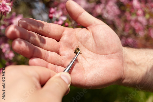 bee, sting, toxin, treatment, poison, hand, hand, tweezer, swelling, pain, palm, finger, nature, garden, tree, blossom, pink, insect, macro, closeup, skin, small, detail, bite, medicals, man, human, body, isolated, wound, health, accident