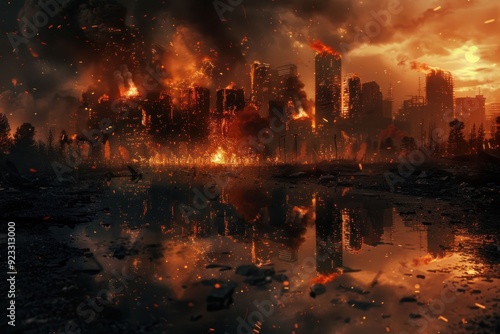Apocalyptic cityscape in flames at sunset with dark smoke and reflections in water