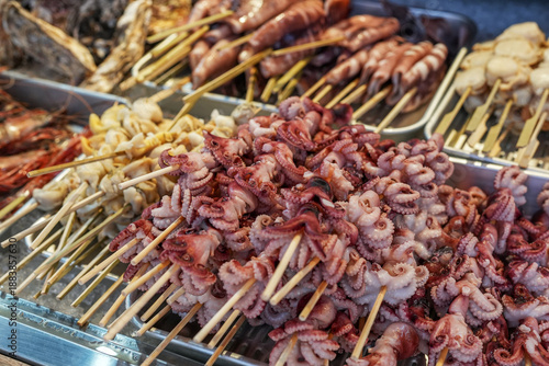 Appetizing baby octopus skewers at a popular Japanese market. Delicious Asian street food. Close-up.