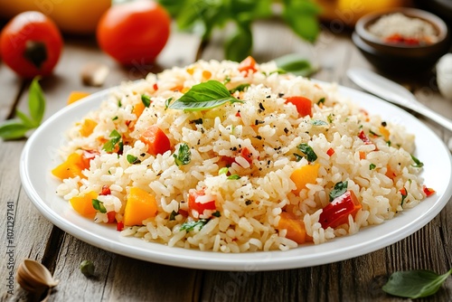 Appetizing healthy rice with vegetables in white plate on a wooden table