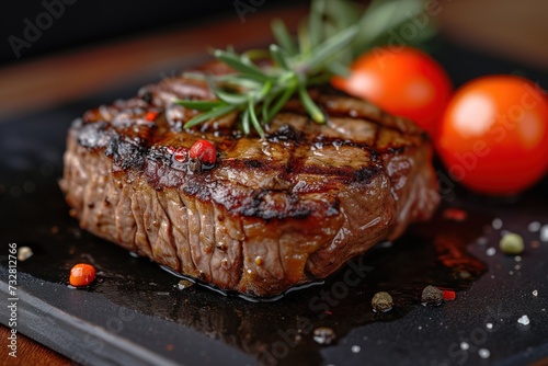 Appetizing juicy grilled steak served with a sprig of rosemary, spices and tomatoes