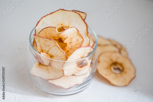 apple chips.Healthy snack.Healthy snack. Tasty dried apple and pear rings chips on light background