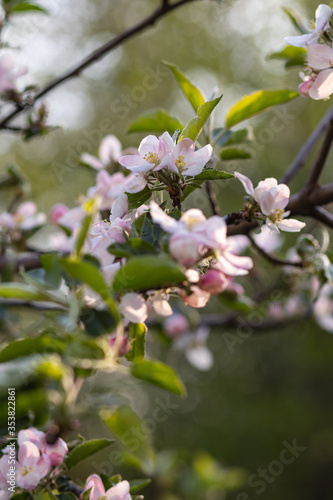 Apple tree blooming with pink flowers in spring