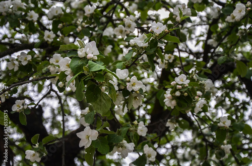 Apple tree white flowers spring blossom on a beautiful calm day with branches and green leafs on the background