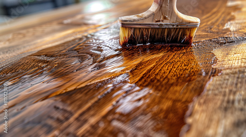 Applying transparent varnish on wood with paint brush. wooden furniture coating and protection