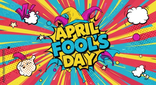 april, day, pop, art, banner, comic, book, jester, hat, vibrant, colours, fun, laughter, surprise, celebration, holiday, design, template, postcard, background, decorative, swirl, stripes, bright, juicy, creative, generative, ai, funny, text, illustration, graphic, artwork, yellow, blue, cartoon, whimsical, explosive, dynamic, cheerful, festive, spring