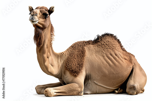Arabian camel resting or sitting on the ground isolated on white background. side view photograph, full body shot.