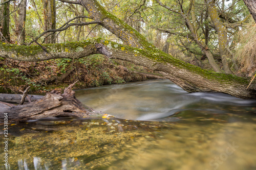 árbol cubierto de musgo descansa sobre el lecho del río.