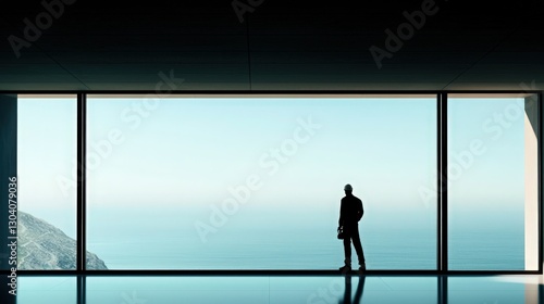 architect, architecture, building, modern architecture, ocean view, seaview, panoramic view, glass window, silhouette, businessman, construction, contractor, men at work, hard hat, engineer, professional, success, achievement, planning, strategy, vision, future, dream, ambition, career, business, industry, design, construction site, coast, cliff, horizon, sky, blue skies, ocean, sea, water, tranquil, calm, peaceful, serene, contemplative, thoughtful, solitude