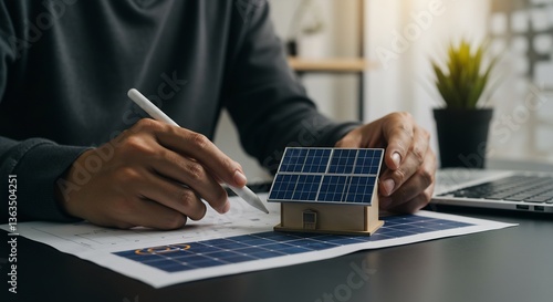 architect, sustainable, home, solar panel, stylus, blueprint, environmentally friendly, housing project, design, planning, renewable energy, technology, green energy, solar energy, architecture, energy efficiency, model house, construction, engineering, drawing, digital, workspace, desk, laptop, hand, person, man, business, professional, work, office, modern, clean, minimal, interior, light, future, innovation, efficiency, environment, residential