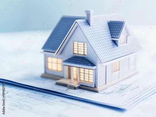 Architectural model on loan documents showcasing intricate house plan in modern workspace