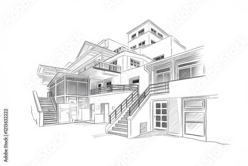 Architectural Sketch Of A Multi Story Building With Staircases