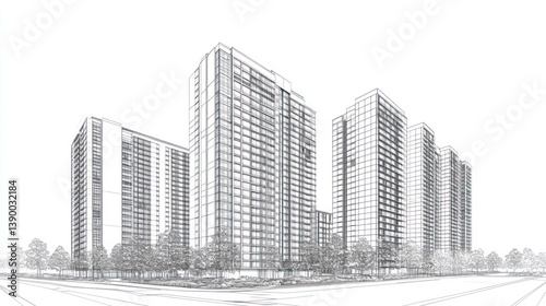 Architectural sketch of modern buildings, urban landscape, digital illustration, possible use for design portfolio or architectural presentation
