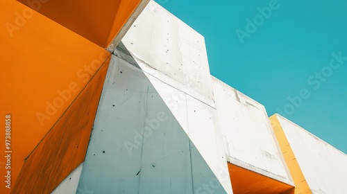 Architecture background abstract geometric shapes. White and orange walls against a blue sky. Modern concrete structure building detail. Architectural construction. Minimal design style. angular lines