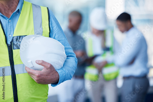 Architecture, meeting and person with helmet in office for project management, team and inspection on tablet. Civil engineering, online planning and contractor at construction site with safety gear