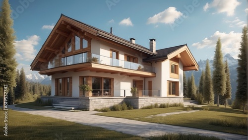 Architecture modern cozy house in chalet style with large garden on sunny summer day, 3D building design illustration