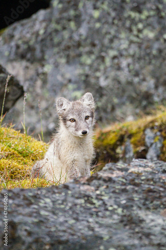 Arctic Fox relaxing at the entrance to its den in the Arctic Circle