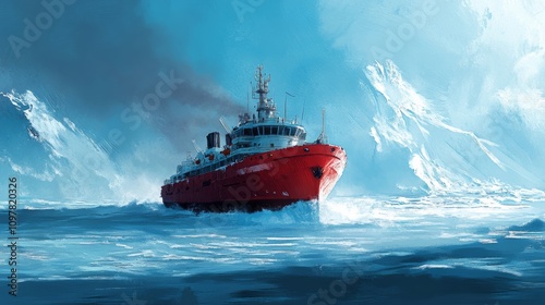 Arctic icebreaker in a frozen ocean, navigating through thick ice layers