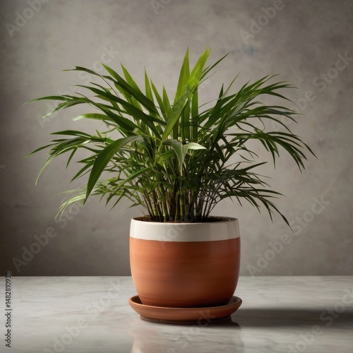 plant, houseplant, areca, palm, pot, indoor, green, leaf, botany, flora, growth, home, decoration, table, marble, surface, container, domestic, still life, studio, background, beige, earthenware, ceramic, saucer, interior, decorative, botanical, tropical, foliage