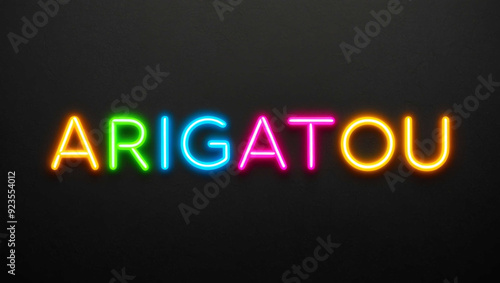 arigatou colorful neon lettering on plain dark black background