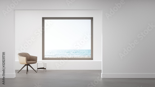 Armchair on concrete floor of large living room in modern house or luxury hotel. Minimal home interior 3d rendering with beach and sea view.