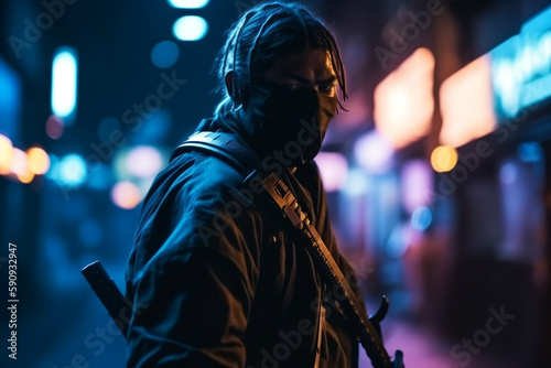 Armed Samurai And Street With Blurred Neon Lights At Night On Background, Made Using Generative Ai