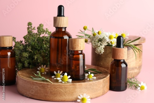 Aromatherapy. Different essential oils and flowers on pink background