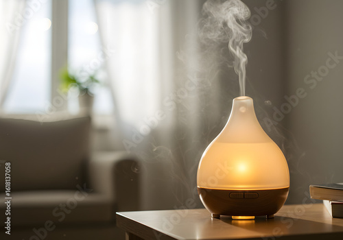 diffuser, aromatherapy, essential oil, oil, vapour, fragrance, scent, home, indoor, relaxation, wellness, well-being, therapy, treatment, health, healthy, lifestyle, modern, table, furniture, background, blur, couch, curtain, natural, light, illumination, glow, warm, still life, interior, design, nobody, soft, minimal, humidifier, aroma, clean, air, refresh, decorative, wooden, surface