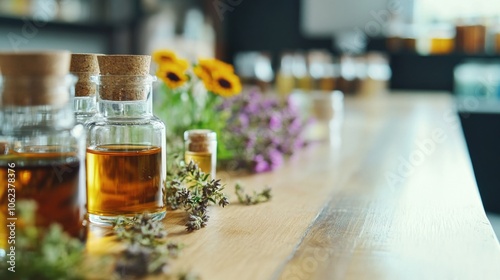 Aromatherapy essential oils and fresh flowers on wooden table for tranquil spa experience