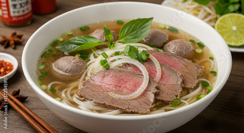 Aromatic bowl of Vietnamese beef pho noodle soup featuring fresh herbs and vibrant toppings