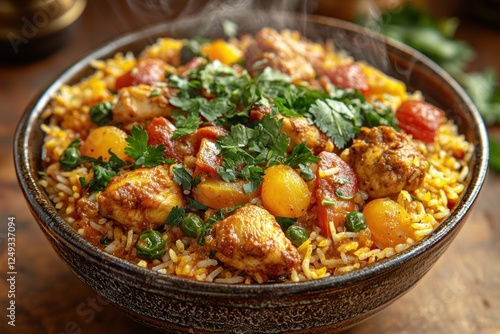 Aromatic chicken biryani served in a rustic bowl with fresh herbs and vegetables