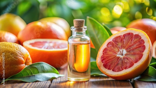 Aromatic Citrus Essence Freshly Squeezed Grapefruit Oil in Glass Bottle with Ripe Fruit and Lush Green Leaves on Rustic Wooden Surface
