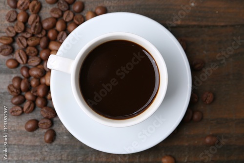 Aromatic coffee in cup and beans on wooden table, flat lay