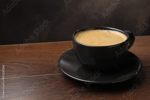 Aromatic coffee in cup on wooden table, closeup. Space for text